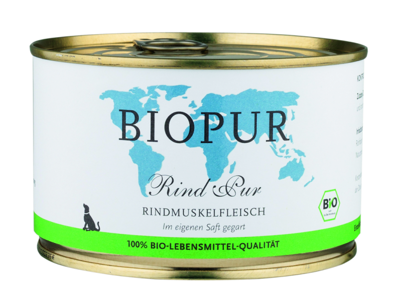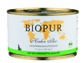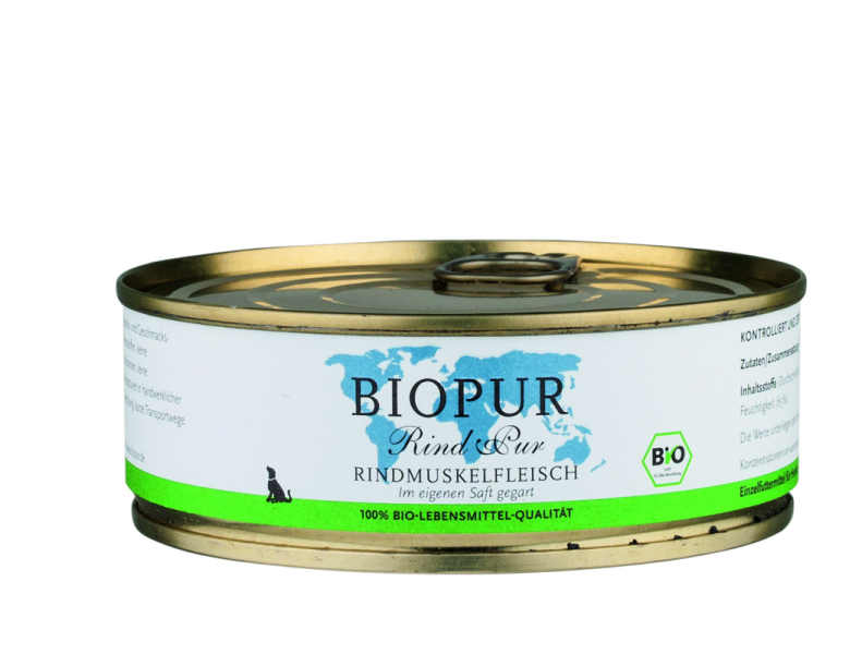 Für alle, die ihr Futter individuell zubereiten möchten, gibt es die BIOPUR-Fleischdosen. Das Fleisch ist im eigenen Saft schonend gegart und besteht aus 100%